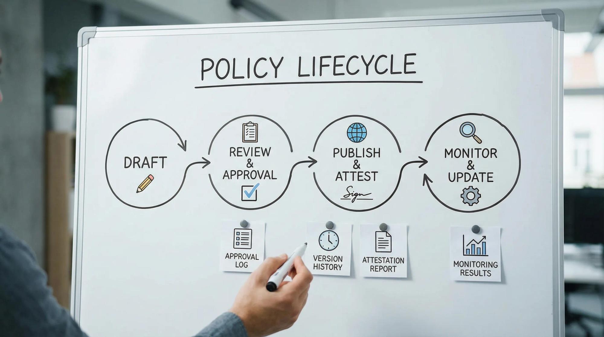 Do we need employee attestation for every policy? Generally no. Use attestations for high-risk policies and for material changes. For lower-risk topics, evidence of availability, communication, and targeted training may be sufficient.