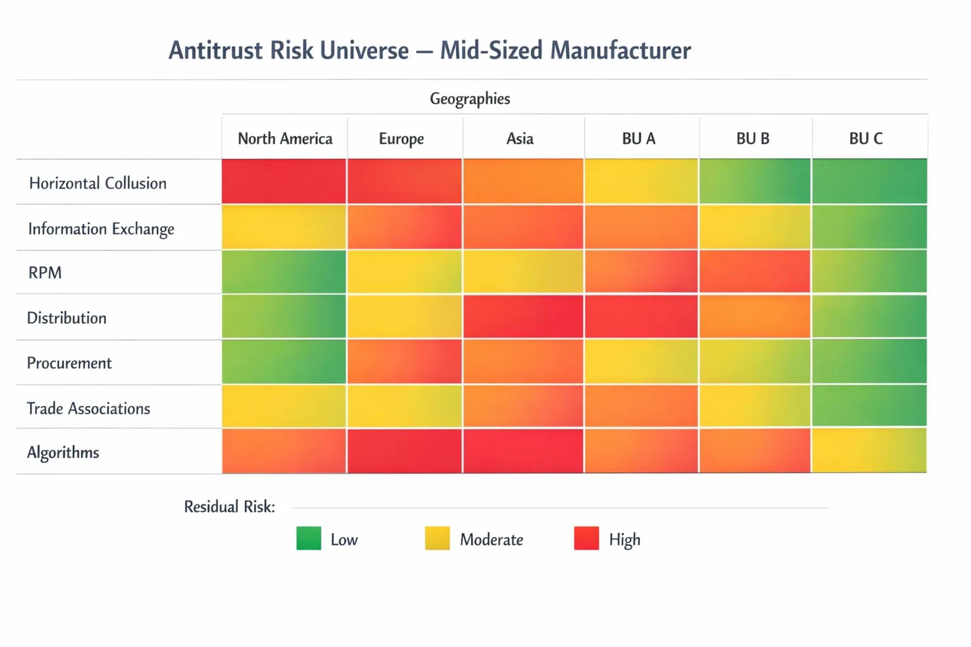- Residual risk index for antitrust, weighted by affected turnover and market sensitivity.
