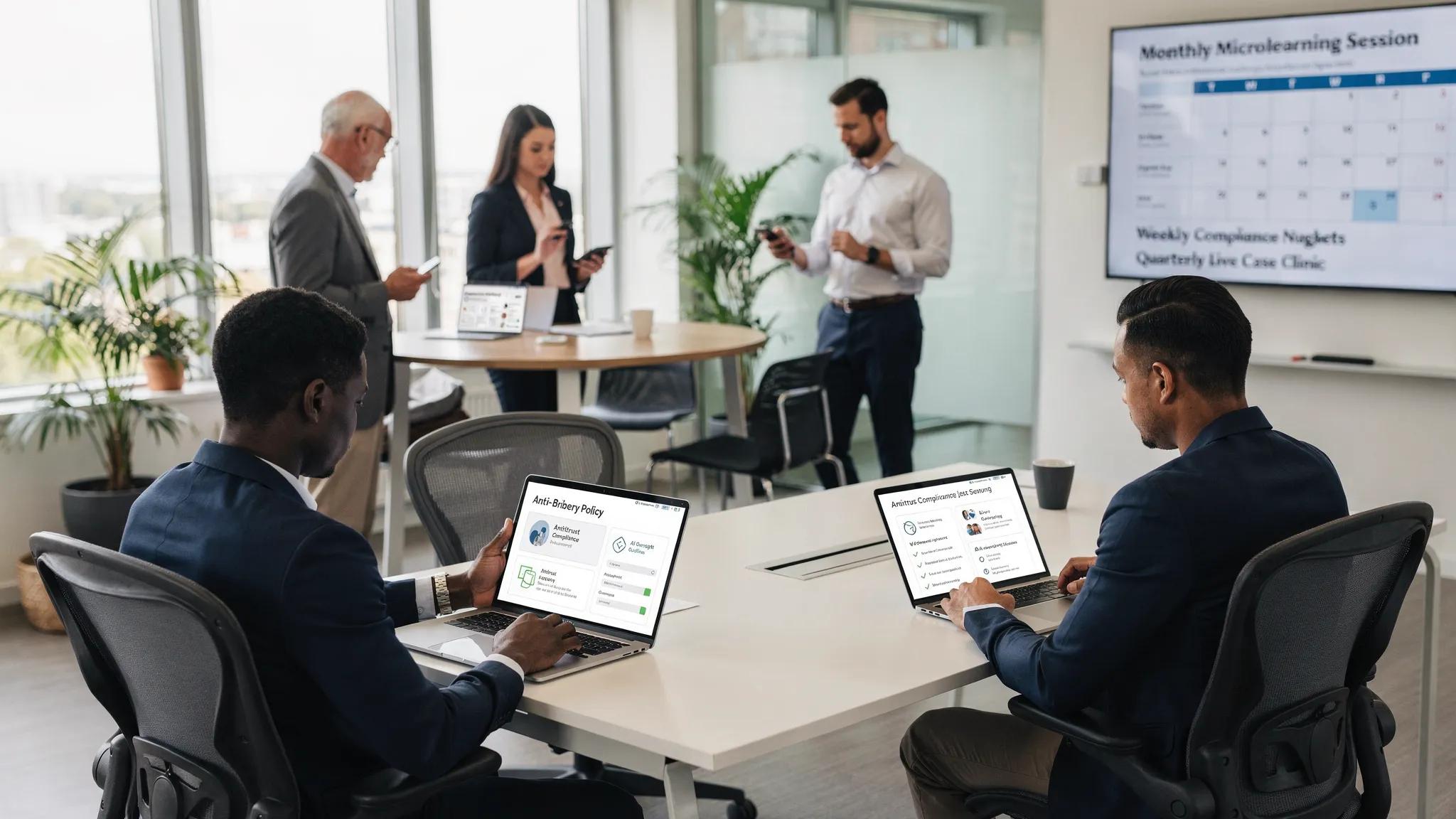 Procurement and operations | Third party due diligence, facilitation payments, bid rigging | Run proportionate diligence, detect bid patterns, apply contracting clauses | Interactive checklist sprints, 10 minute microlearning modules | Monthly | Diligence records, module results, exception logs |